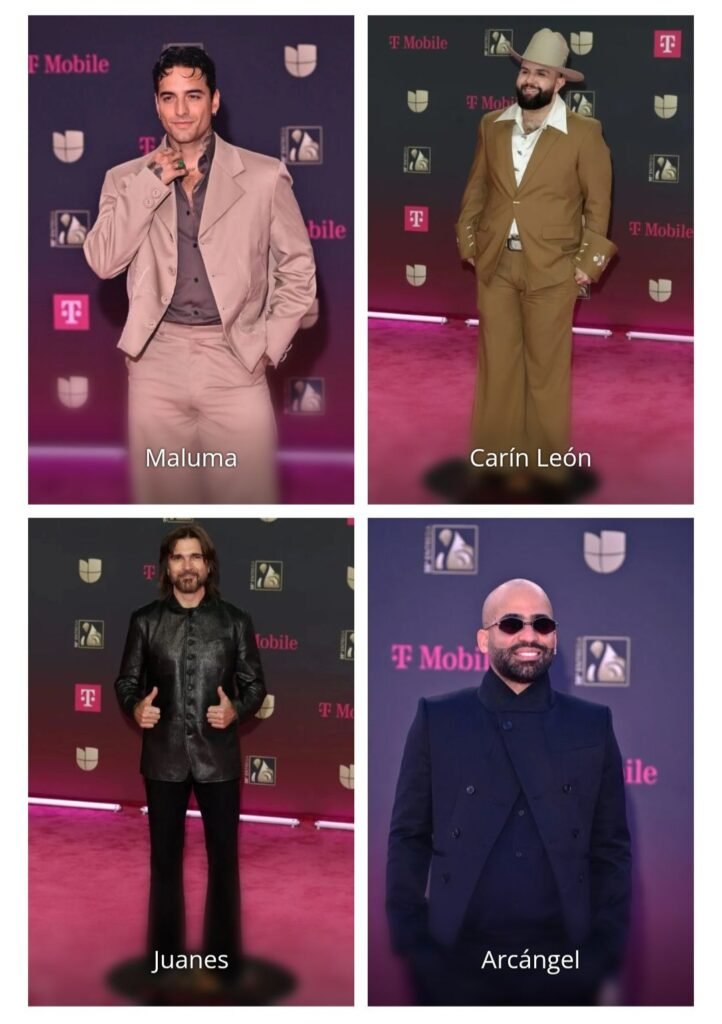 El colombiano Maluma y el mexicano Carín León optaron por trajes en tono caqui, sin corbata. Maluma añadió un llamativo anillo de esmeraldas como guiño a su país, mientras que Carín León complementó su look con un sombrero vaquero.