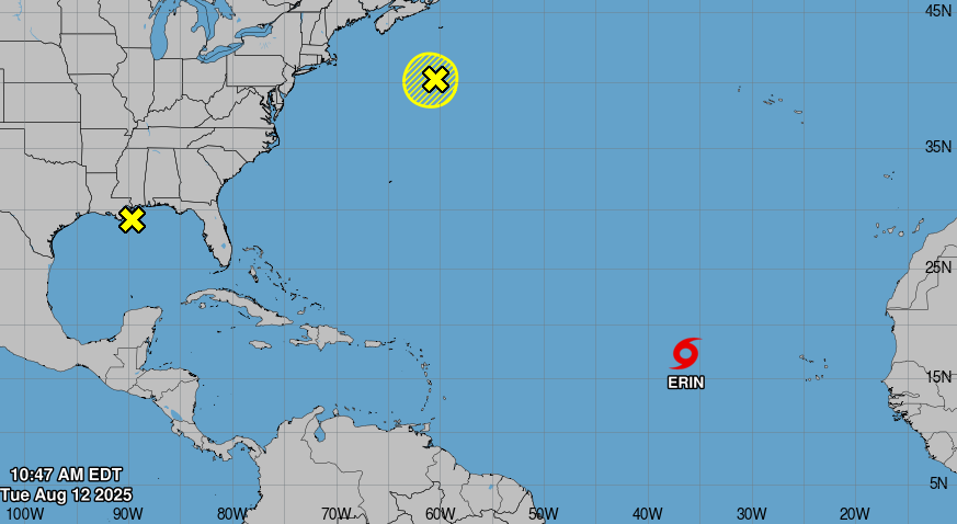 Erin es la quinta tormenta tropical de la temporada atlántica de 2025, tras Andrea, Barry, Dexter y Chantal, esta última la única que ha tocado tierra en Estados Unidos, provocando dos muertes en Carolina del Norte el pasado julio.